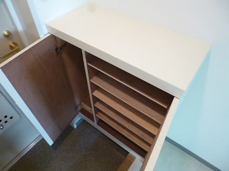 玄関を開けると、存在感ある白いシューズボックスがあります